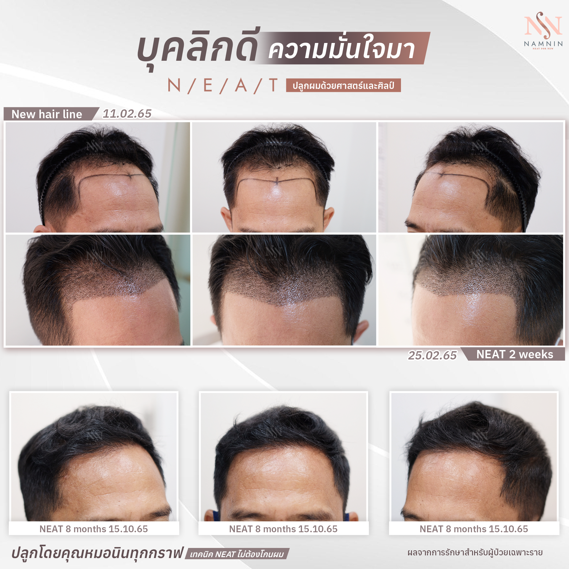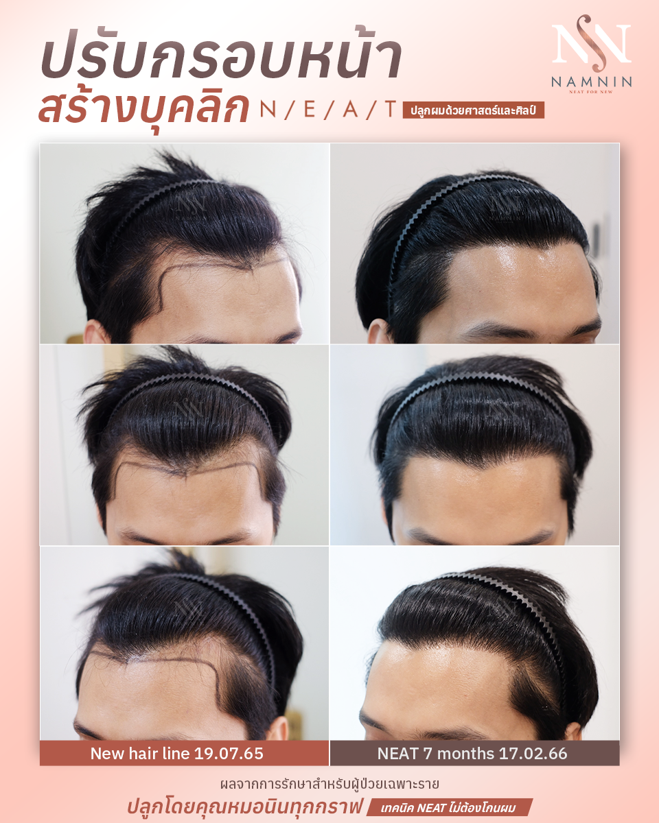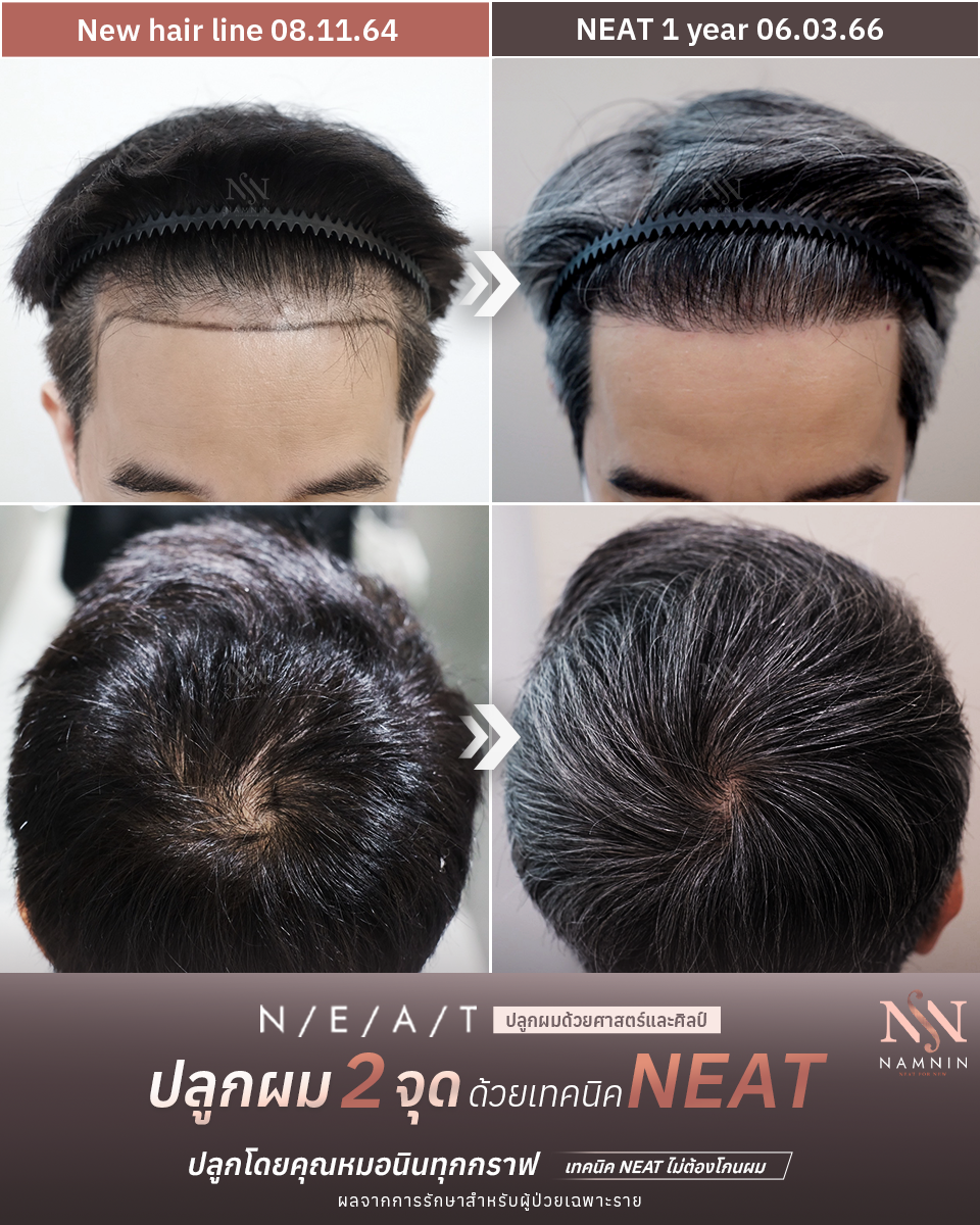สำหรับเทคนิค NEAT คุณหมอนินจะวางแผนการรักษาร่วมกันกับคนไข้ โดยคุณหมอจะเป็นผู้ลงมือปลูกผมให้เองทุก ๆ กราฟต์ เติมความประณีตพิถีพิถัน เน้นปักกราฟต์ผมตามทิศทางองศาเดิมเพื่อความกลมกลืนแลดูเป็นธรรมชาติ ทั้งยังติดตามดูแลหลังปลูกตลอด 1 ปีเต็ม จนกว่าผมใหม่จะเติบโต แข็งแรง สมบูรณ์