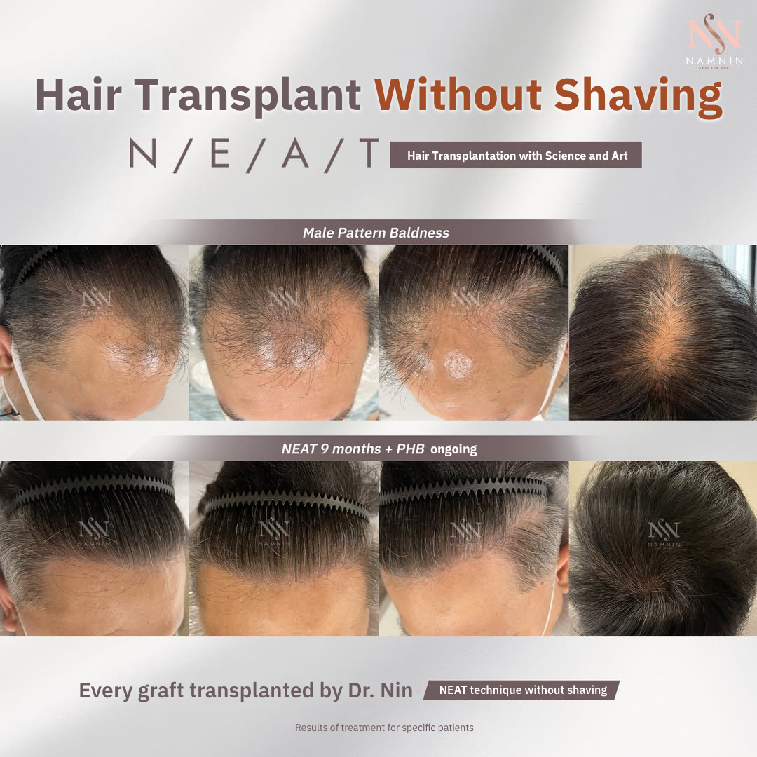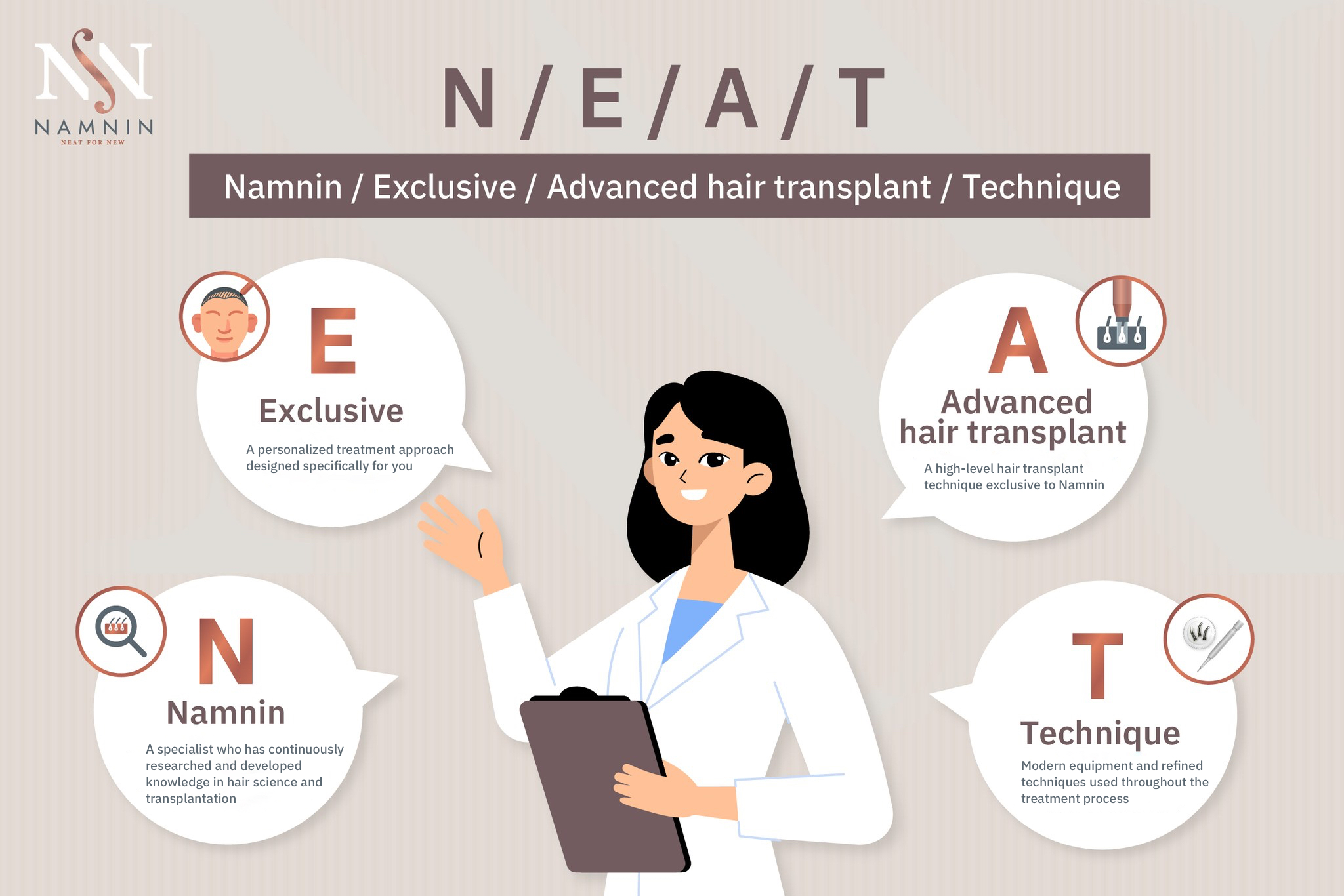 One signature technique of Namnin is NEAT, which stands for Namnin’s Exclusive Advanced Hair Transplant Technique. This advanced method blends both science and artistry, and each letter represents Dr. Nin’s philosophy.