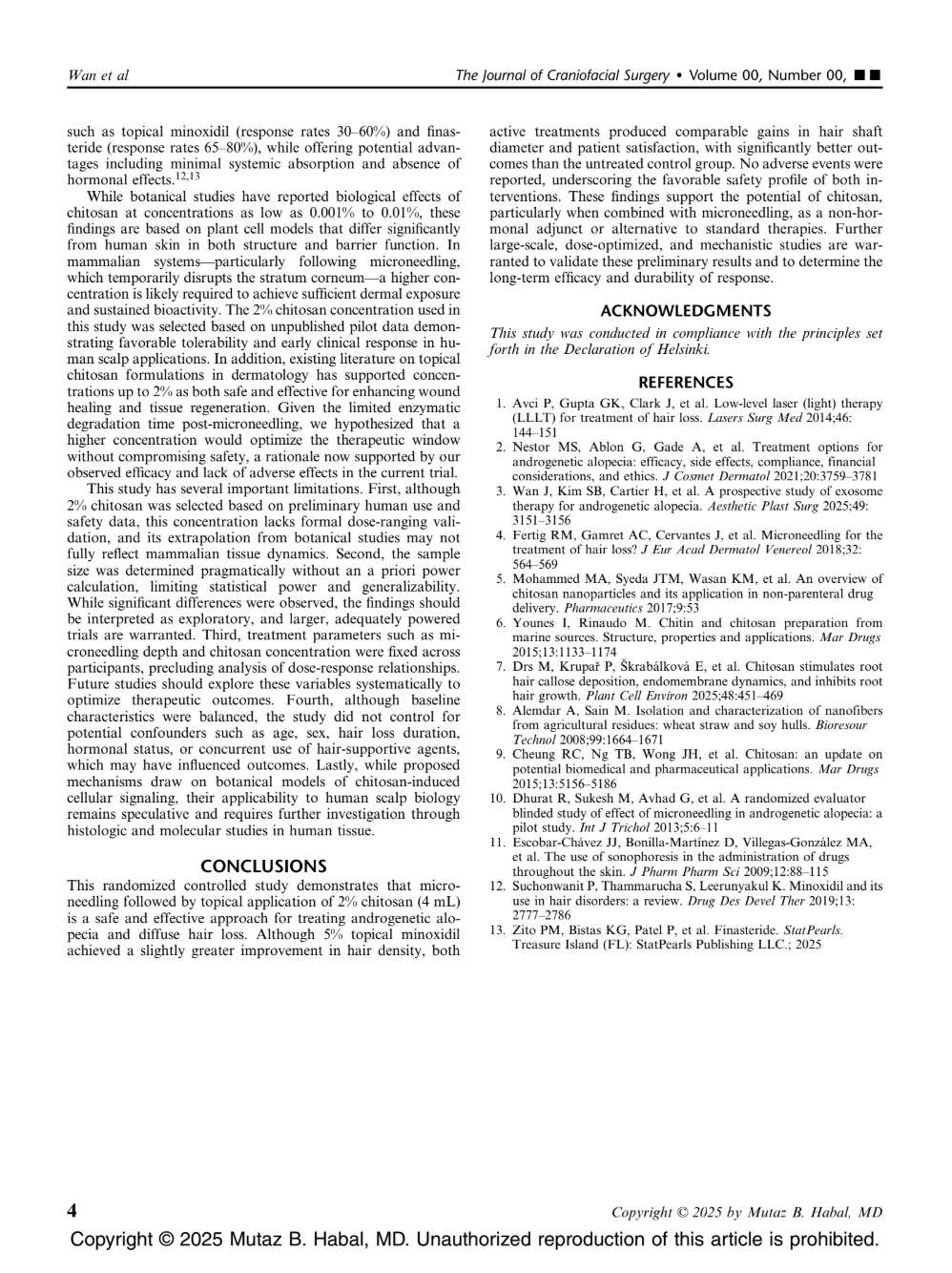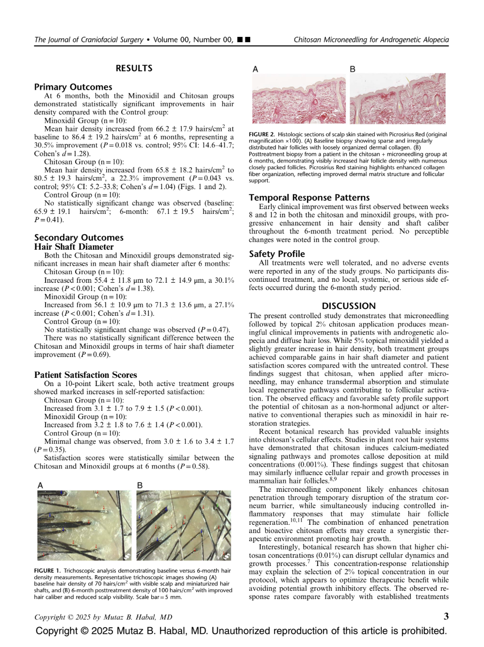 ทีมวิจัยพบว่า สารสกัดไคโตซานจากเห็ดในปริมาณที่เหมาะสม ให้ผลลัพธ์ที่น่าพอใจไม่แพ้การรักษาด้วย Minoxidil สังเกตได้จากขนาดเส้นผมที่ใหญ่ขึ้น ความถี่ในการงอกของเส้นผมมากขึ้น สามารถลดการหลุดร่วงให้น้อยลง ทั้งยังเกิดโอกาสการระคายเคืองน้อยกว่ามาก