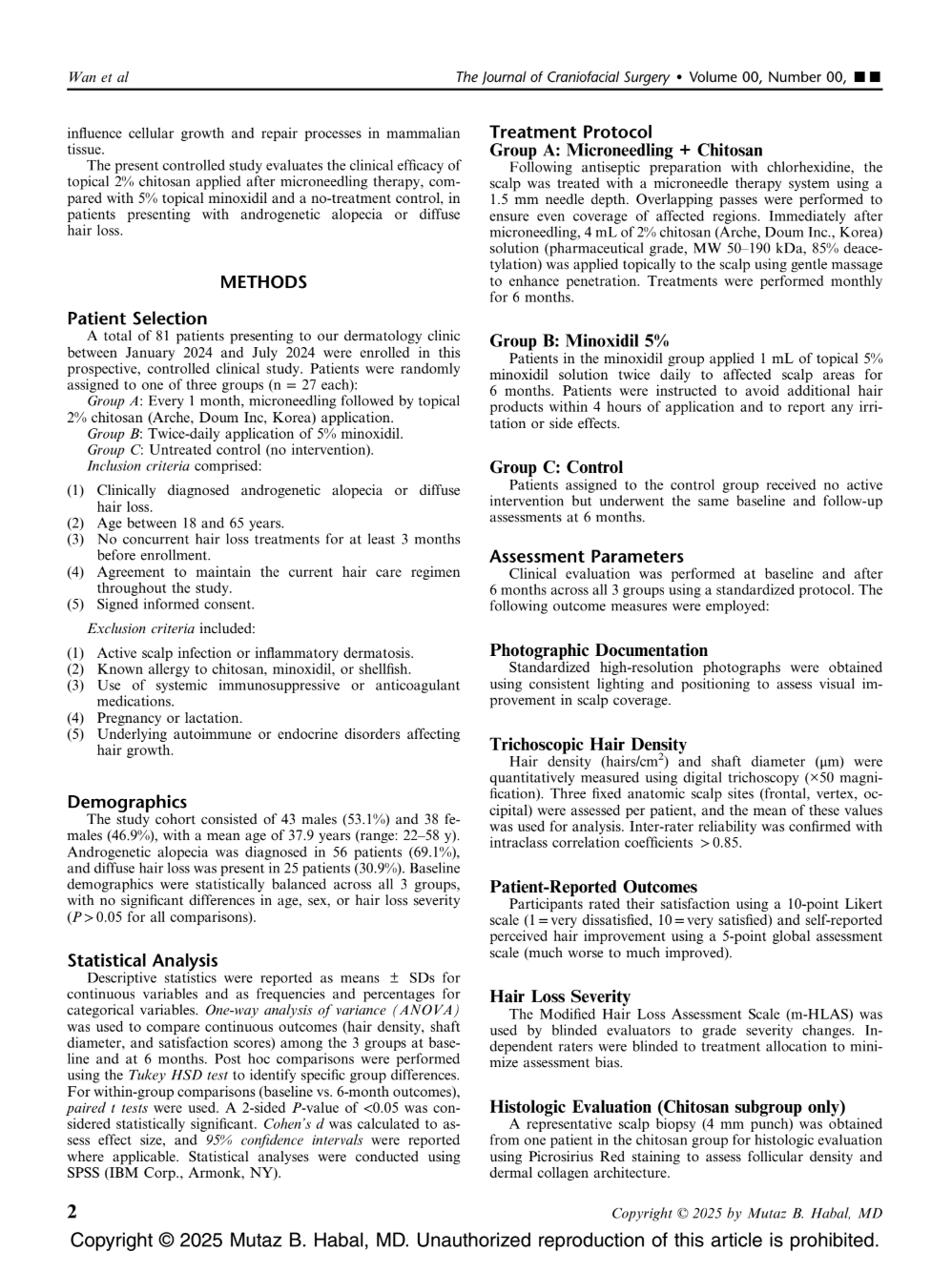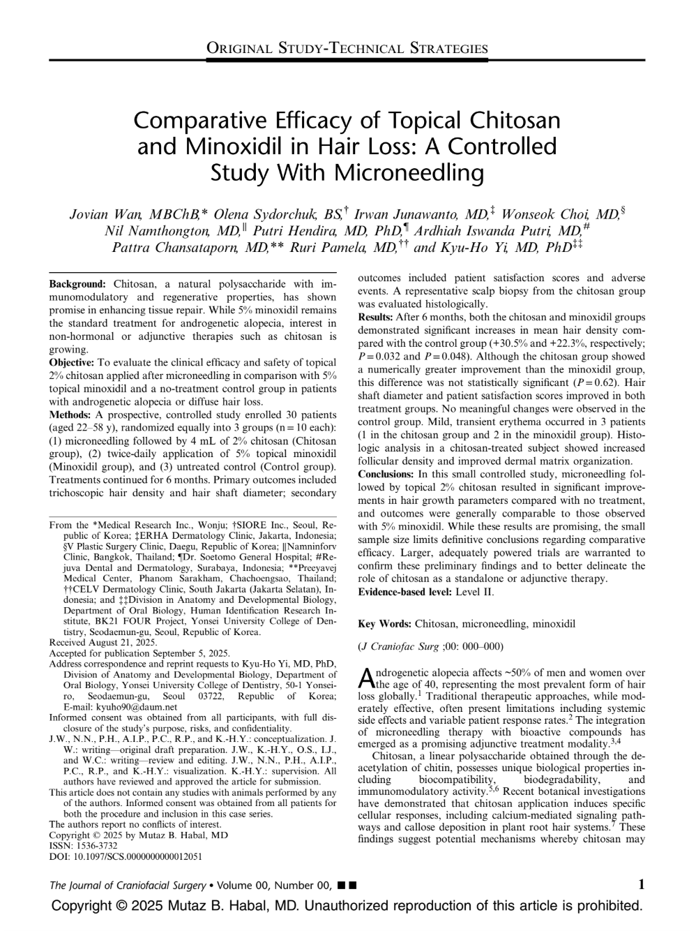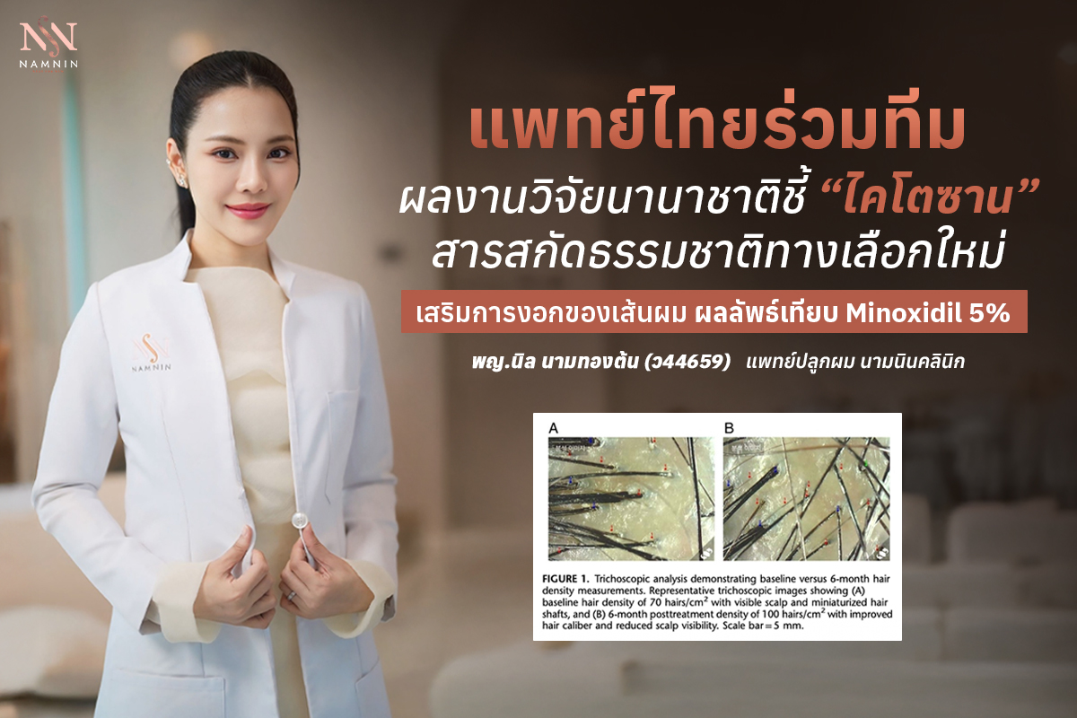 นั่นจึงเป็นที่มาของงานวิจัยระดับนานาชาติ ที่คุณหมอนินร่วมมือกับทีมแพทย์ชั้นนำจากเกาหลีใต้และอินโดนีเซีย เพื่อค้นหาสารสกัดธรรมชาติจากพืช ที่สามารถรักษาอาการผมร่วง ผมบาง โดยไม่ก่อให้เกิดผลข้างเคียง โดยงานวิจัยในหัวข้อ Comparative Efficacy of Topical Chitosan and Minoxidil in Hair Loss: A Controlled Study with Microneedling ได้รับการตีพิมพ์ใน The Journal of Craniofacial Surgery วารสารชั้นนำด้านศัลยกรรมกะโหลกศีรษะและใบหน้า ที่ช่วยพัฒนาการรักษาและเทคนิคใหม่ ๆ เพื่อผู้ป่วยทั่วโลก