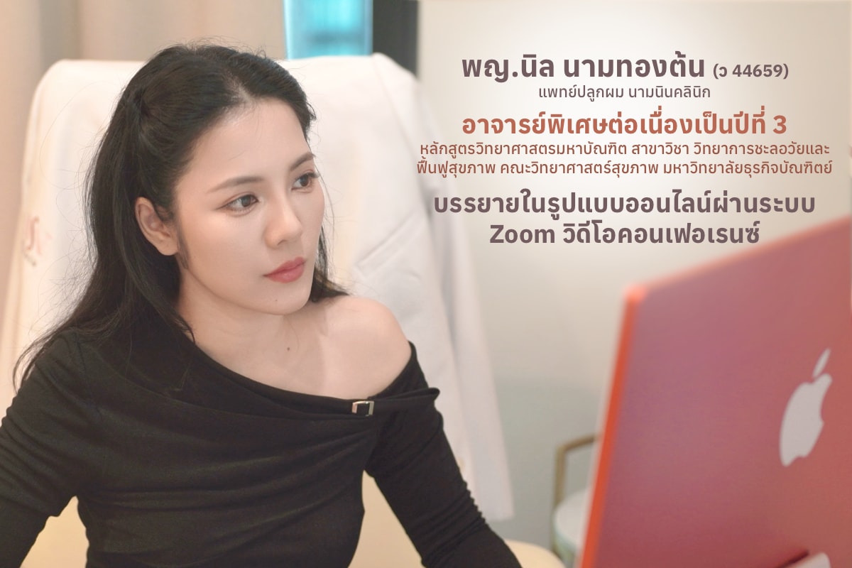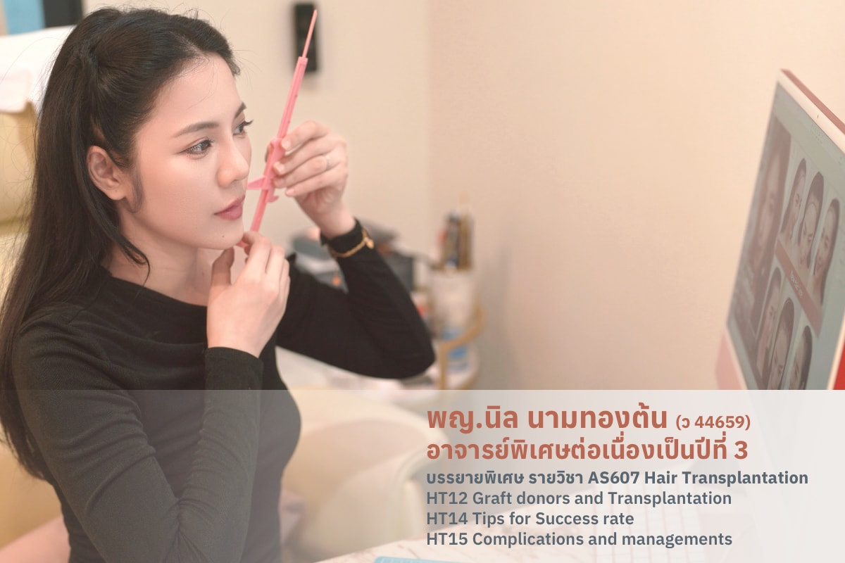 คุณหมอนินรับผิดชอบการสอนในรายวิชา AS607 Hair Transplantation การปลูกผม โดยแบ่งการบรรยายออกเป็น 2 ช่วงในรูปแบบออนไลน์ผ่านระบบ Zoom วิดีโอคอนเฟอเรนซ์ ในวันเสาร์ที่ 18 เมษายน 2569