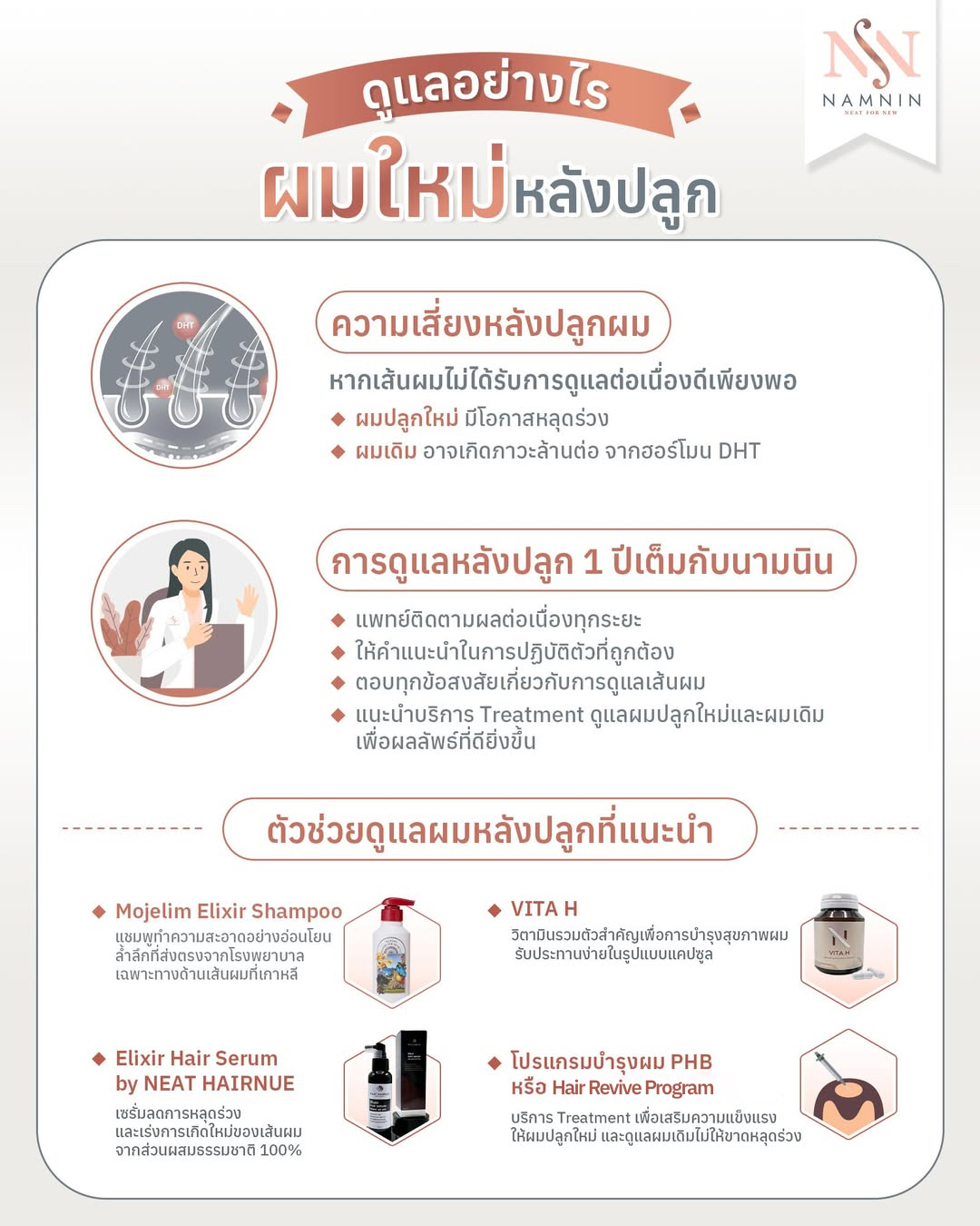 ทราบหรือไม่ว่า คนไข้สามารถสระผมและบำรุงผมได้ด้วยตัวเองที่บ้าน โดยนามนินจะจัดชุดผลิตภัณฑ์ทำความสะอาดเส้นผมสูตรอ่อนโยน รวมถึงผลิตภัณฑ์ดูแลหลังปลูกผมอื่น ๆ นำเข้าจากโรงพยาบาลปลูกผมชั้นนำของเกาหลีไว้ให้