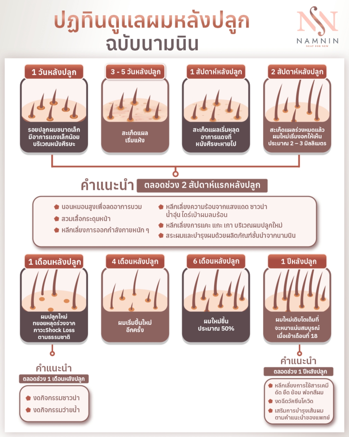 และไม่ต้องกังวลใจไป เพราะนามนินได้รวบรวมข้อควรระวัง หรือข้อปฏิบัติเบื้องต้นง่าย ๆ ในการดูแลตัวเอง แบ่งตามปฏิทินหลังปลูกผมช่วงสำคัญต่าง ๆ ตลอดระยะการดูแลหลังปลูก ดังนี้