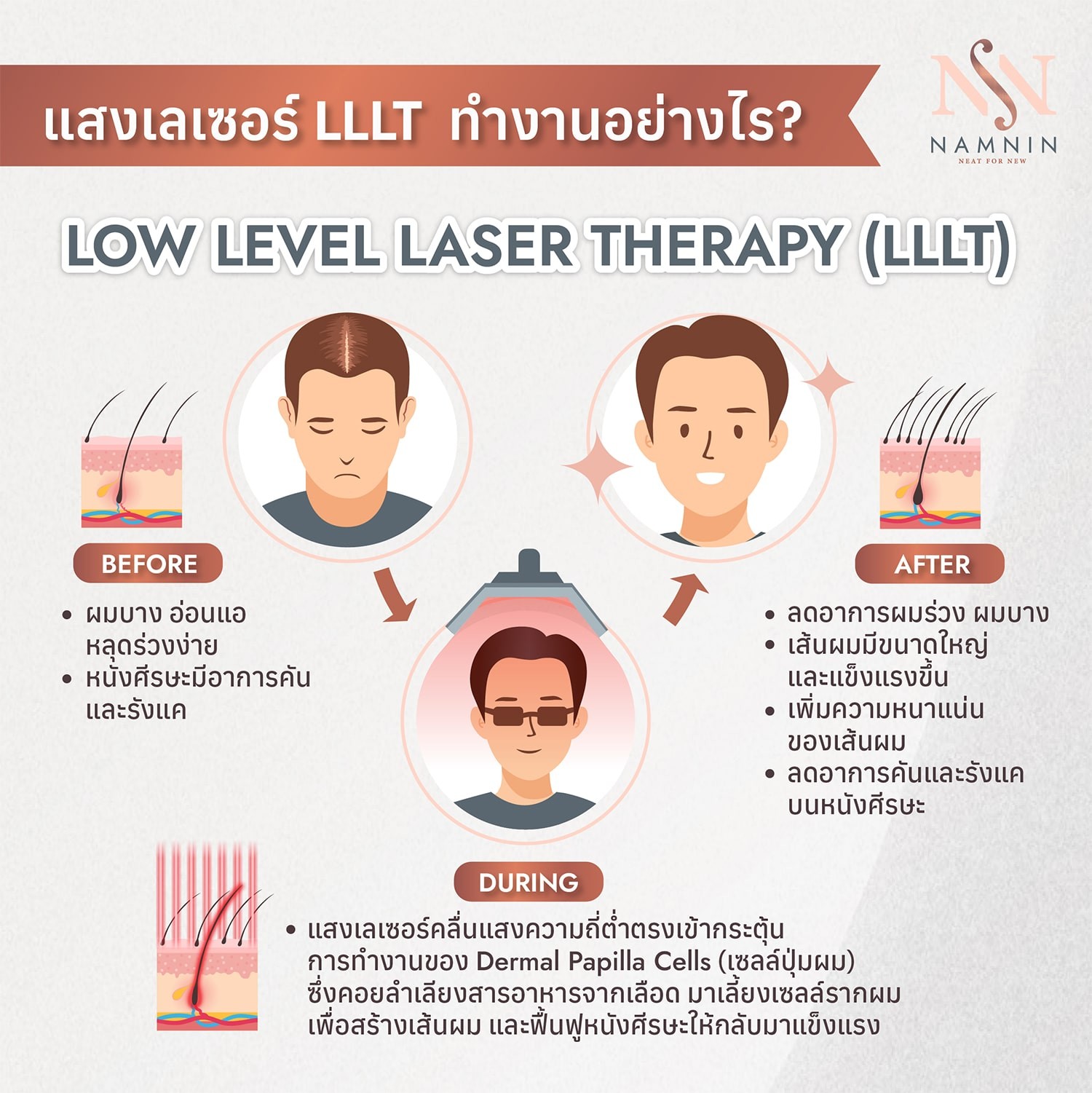 หลังจากคุณหมอนินได้วางแผนการรักษาแล้ว เข้ารับบริการต่อด้วยขั้นตอนการฉายแสง LLLT (Low-Level Laser Therapy) คลื่นแสงความถี่ต่ำที่ตรงเข้ากระตุ้นเซลล์ปุ่มผม ซึ่งทำหน้าที่ลำเลียงสารอาหารและออกซิเจนจากเลือดเข้าสู่รากผม การฉายแสงช่วยเพิ่มการไหลเวียนของเลือด ฟื้นฟูรากผม กระตุ้นการงอกใหม่ และเสริมความหนาแน่นให้เส้นผม