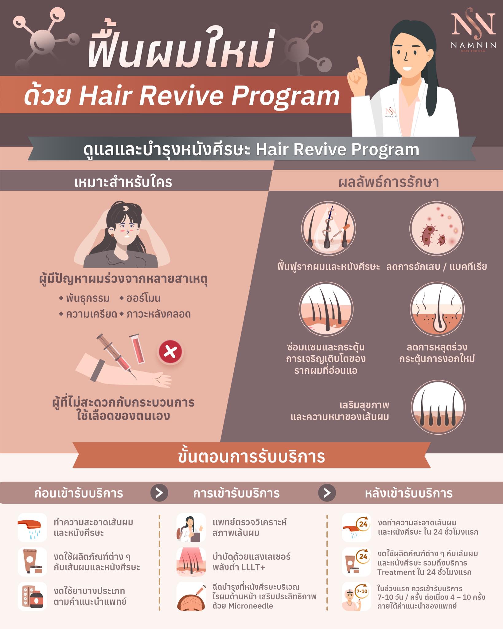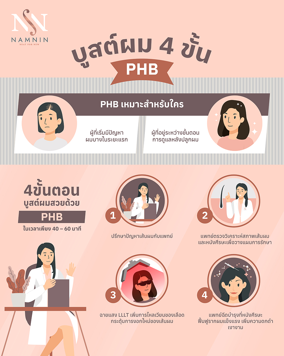 สองโปรแกรมนี้จะมีเทคนิคแตกต่างกันเล็กน้อย โปรแกรม PHB จะเป็นการฉีดสารบำรุงเข้าที่หนังศีรษะ เพื่อเติมเต็มความแข็งแรงให้รากผมโดยตรง ช่วยให้เส้นผมที่อ่อนแอกลับมามีชีวิตชีวา ดกดำ และเงางามขึ้น ส่วน Hair Revive Program เหมาะสำหรับผู้ที่ต้องการบำรุงลึกแต่ไม่สะดวกใจกับการใช้เลือดของตนเอง เป็นการบำรุงด้วยเทคนิค Microneedle Therapy โดยใช้เข็มขนาดเล็กเพียง 0.5 มิลลิเมตร สะกิดเบา ๆ บนหนังศีรษะ เพื่อเปิดทางให้ตัวยาซึมซาบได้ดียิ่งขึ้น พร้อมกระตุ้นการสร้างคอลลาเจนและเซลล์ผมใหม่ จากนั้นจึงลงผลิตภัณฑ์บำรุงเฉพาะจุด เพื่อเสริมความแข็งแรงให้รากผมในระยะยาว ซึ่งคุณหมอนินจะเป็นผู้ให้คำแนะนำและเลือกแนวทางการดูแลที่เหมาะสมให้แต่ละท่านค่ะ