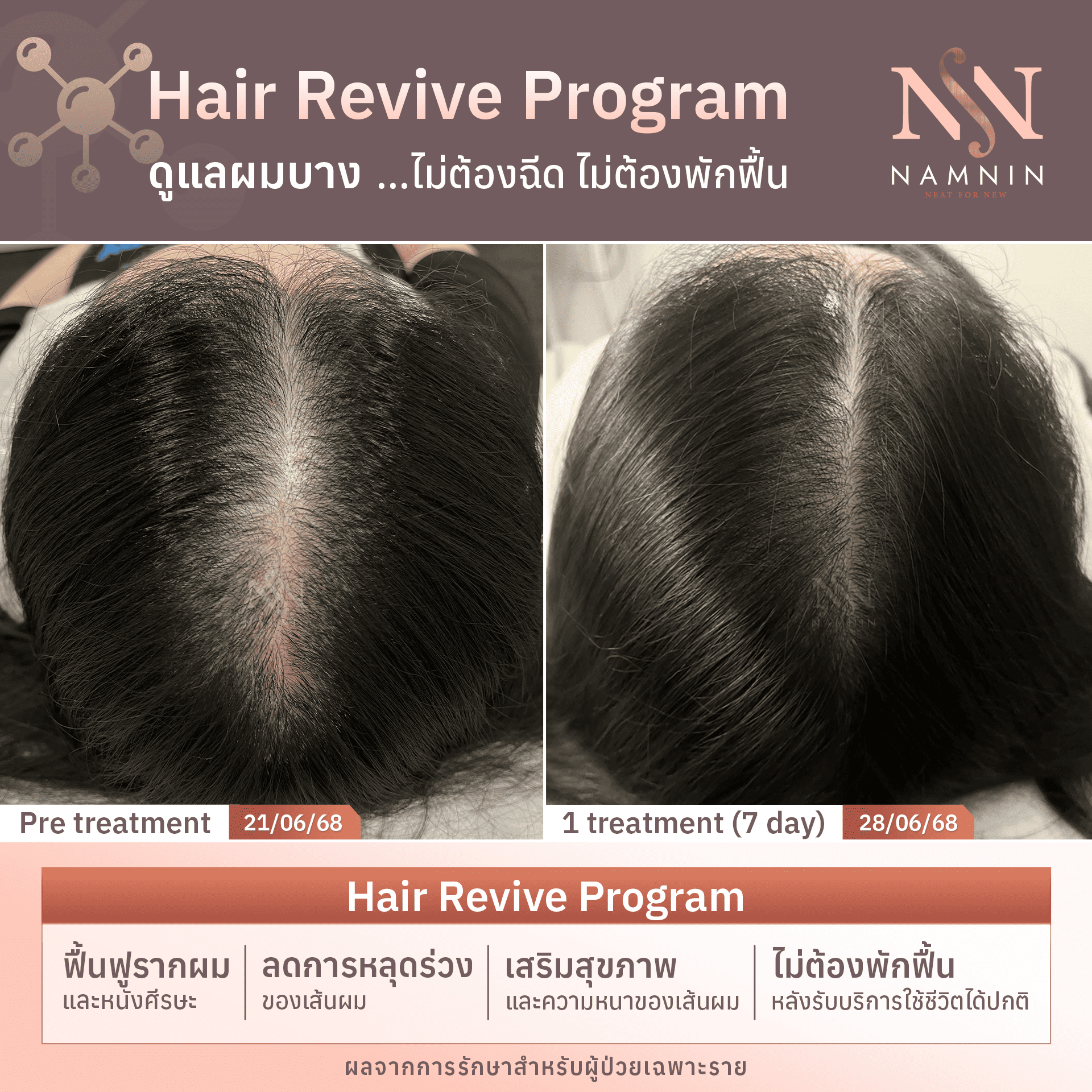 เมื่อดูแลต่อเนื่องตามคำแนะนำของแพทย์ ทั้งสองโปรแกรมจะค่อย ๆ กระตุ้นให้เส้นผมกลับมางอกใหม่ เพิ่มความหนาแน่น และทำให้เส้นผมดูสุขภาพดีขึ้นอย่างเห็นได้ชัด เส้นผมที่เคยบางจะค่อย ๆ กลับมามีชีวิตชีวาอีกครั้ง พร้อมคืนความมั่นใจให้คุณได้อย่างอ่อนโยนและยั่งยืน