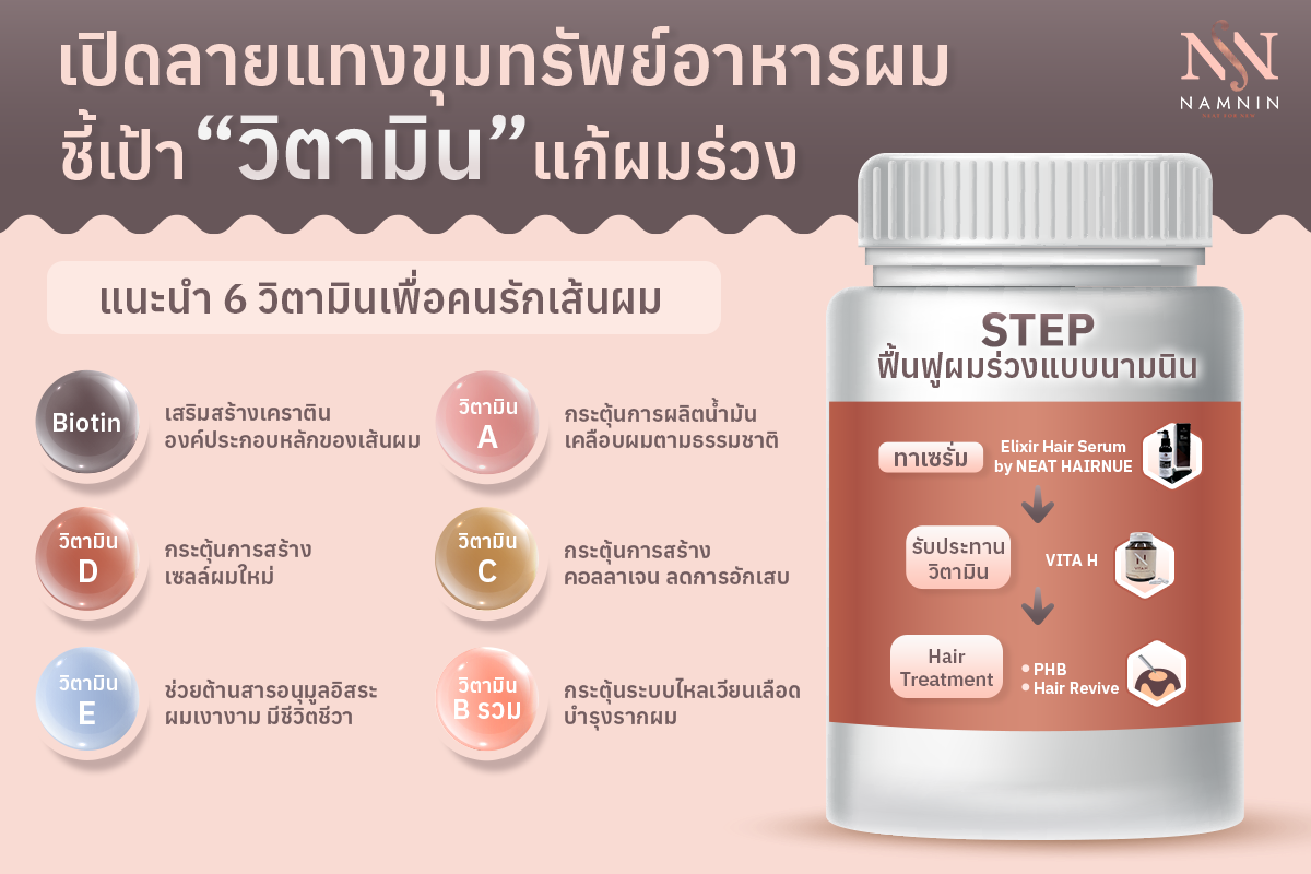 นามนินจึงขอแนะนำคุณประโยชน์ของวิตามินชนิดต่าง ๆ ที่จะช่วยเสริมให้เส้นผมสุขภาพดีจากภายใน ไม่หลุดร่วงง่าย ไม่ต้องโบกมือบ๊ายบายเส้นผมไปก่อนเวลาอันควร เพราะบางครั้งสาเหตุของอาการผมร่วง ก็มาจากการขาดวิตามินบางชนิดได้เหมือนกัน โดยเราสามารถเลือกรับประทานอาหารที่มีวิตามินสูง หรือรับประทานวิตามินเสริมเพื่อบำรุงและฟื้นฟูเส้นผม ภายใต้คำแนะนำของแพทย์