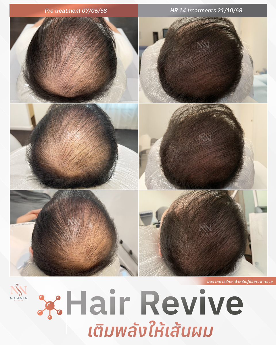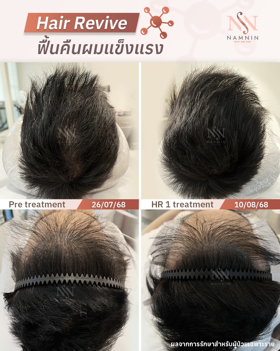 และสำหรับผู้ที่เห็นว่าผมบางชัดเจนขึ้น ยังไม่ต้องกังวลมากเกินไปค่ะ เพราะการแก้ปัญหานั้นไม่ได้หมายความว่าจำเป็นต้องปลูกผมเสมอไป เพราะผมบางในระยะเริ่มต้นยังสามารถฟื้นฟูได้ หากแพทย์ประเมินแล้วว่ายังมีรากผมอยู่ ซึ่งที่นามนิน คลินิก มี Hair Revive Program โปรแกรมฟื้นฟูเส้นผมที่ดูแลโดย พญ.นิล นามทองต้น ในทุกขั้นตอน เริ่มตั้งแต่การวิเคราะห์สภาพหนังศีรษะ การฉายแสง LLLT และการบำรุงรากผมด้วยเทคนิค Microneedle Therapy โดยใช้เข็มเล็กๆ สะกิดเบาๆ ที่หนังศีรษะเพื่อเพิ่มการดูดซึมตัวยา กระตุ้นการสร้างคอลลาเจนและกระตุ้นการสร้างเซลล์รากผม ช่วยฟื้นฟูรากผมและหนังศีรษะ ลดการหลุดร่วงของเส้นผม และคืนชีวิตชีวาให้เส้นผมที่อ่อนแอ หลังเข้ารับบริการต่อเนื่อง ผมบริเวณที่เคยบางจะเริ่มกลับมาหนาขึ้น เส้นผมแข็งแรงและหนังศีรษะมีสุขภาพดี เส้นผมจะค่อย ๆ กลับมาแข็งแรงและดูหนาแน่นขึ้น