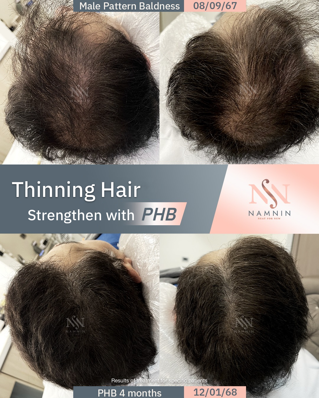 Namnin recommends the PHB Program, a revitalizing treatment that nourishes and rejuvenates hair from deep within. It works by stimulating the hair follicle cells to repair themselves and promote new hair growth, helping strengthen both hair and scalp while slowing hair loss effectively. Noticeable improvements can be seen as early as the first session.